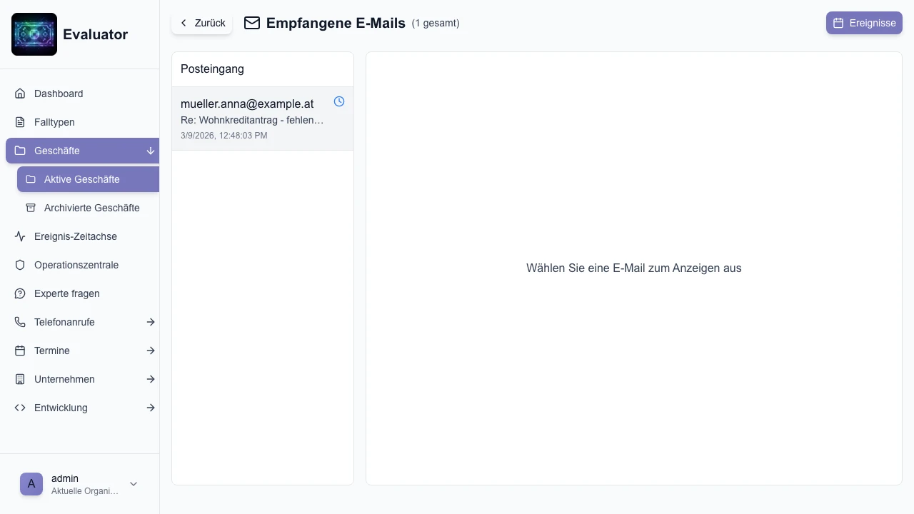 Sie verfolgen den Prozess kontinuierlich und prüfen dann den vorverarbeiteten Antrag auf der Admin-Oberfläche vor der Bankauswahl und Kreditantragseinreichung.